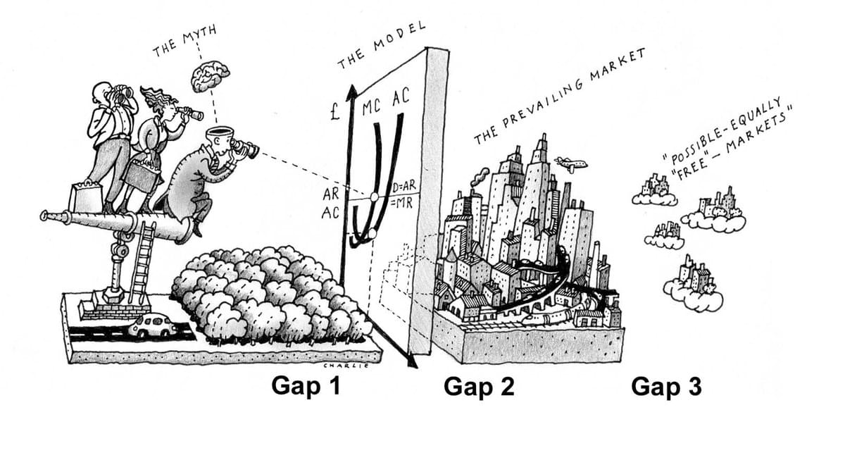 The central message of the Market Myth is that there are many possible free markets, and that we can decide what our free market should be like. “We have created the market and we can change it. It may not be possible to imagine a world without a market, but it is possible to think of one where the market helps to discourage greed, selfishness, cynicism and exploitation, rather than positively encourages them. Like all social constructs, the market could be different”.
